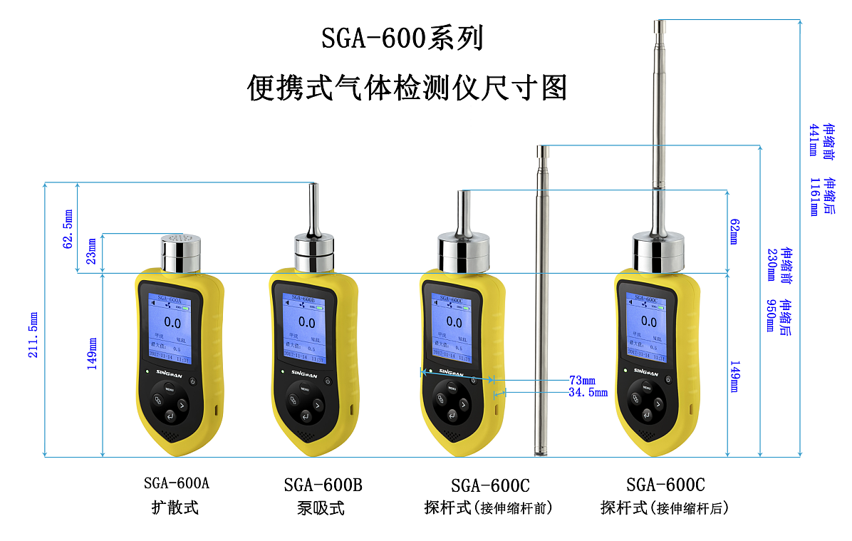 SGA-600系列便携式气体检测仪按使用方式共分为:SGA-600A系列便携扩散式癸烷气体检测仪、SGA-600B系列便携泵吸式癸烷气体检测仪和SGA-600C系列便携探杆式癸烷气体检测仪三款,具体区别请参照下面产品参数列表。